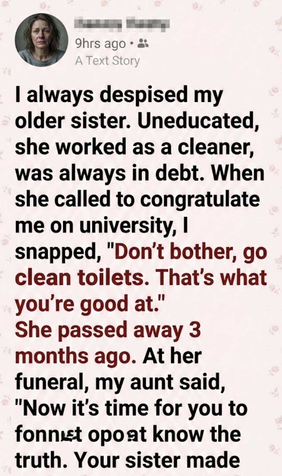“She never got a proper education or a good job because she wanted you to have it all,” my aunt said softly. “It was a family secret. She forbade everyone from telling you. She said if you knew, you’d feel pressured. Or guilty. She wanted you to succeed freely.”