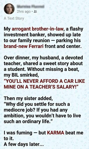 At a recent family reunion, my brother-in-law, Tom, a successful yet arrogant lawyer, decided to belittle my husband, David, a humble teacher. Tom’s wealth, flaunted through his flashy Ferrari, often made him the center of attention, and this year was no different.