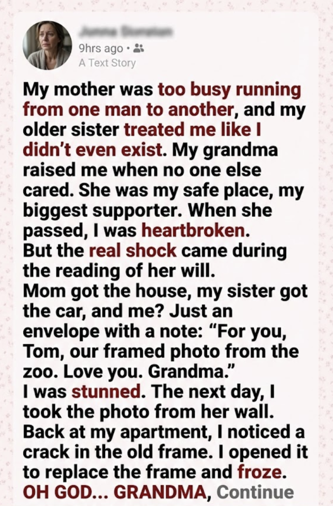 The next day, I went back to her house while my mom and sister were busy arguing over furniture. I took the framed photo from the wall—the one of us at the zoo when I was ten. I was grinning, missing a tooth. Grandma had her arm around me, eyes crinkled with joy.