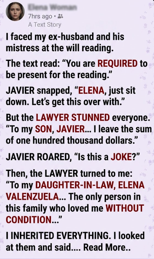 The heavy oak door of the notary’s office felt like a barrier between two worlds, separating the quiet sanity of the hallway from the suffocating toxicity waiting inside, yet I walked through it knowing that my ex-husband, his mistress, and his mother would be waiting like vultures circling a carcass. I showed up anyway, not because I wanted to see the faces that had haunted my nightmares for the past year, nor because I missed the life I had violently lost, but because the message on my phone had made my stomach drop with a command I couldn’t ignore: “You are required to be present for the reading.” When I finally stepped into the room, the air was thick with the scent of expensive leather and old paper, a smell that usually comforted me but today made me nauseous. I didn’t sit down in the empty chair they had left for me; instead, I stayed standing near the bookshelf with my arms crossed tight against my chest, as if keeping my body rigid enough would prevent my heart from betraying the anxiety thundering against my ribs. The lawyer, Gavin Herrera, looked up from his desk, adjusted his wire-rimmed glasses, and spoke with a professional calm that contrasted sharply with the tension in the room, looking directly at me to say, “Mrs. Valenzuela… I’m glad you decided to join us.”
