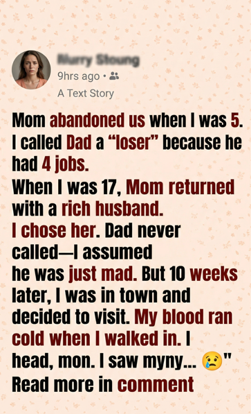 When I saw him, tubes everywhere, face pale and thinner than I remembered, my knees nearly gave out. I broke down, sobbing, begging him to forgive me for leaving. For choosing my mother. For calling him a loser.