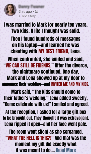 When Sarah is invited to the wedding of her ex-husband and ex-best friend, she chooses grace over chaos, or so it seems. In a story about betrayal, resilience, and the power of quiet truth, one woman brings a gift that no one saw coming… and no one will ever forget.