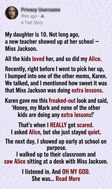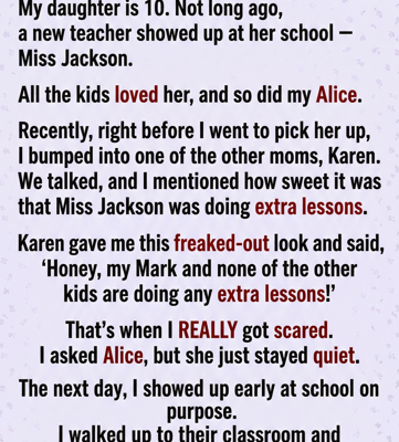 So when Miss Jackson started at Clearview Elementary, I was relieved. She had this way about her—young, maybe early thirties, stylish in that earthy kind of way, and always smiling like she knew something wonderful that hadn’t happened yet. Alice started talking about school more, and even wanted to get there early. She’d chatter away about “Miss J” and how she made class “less boring.”