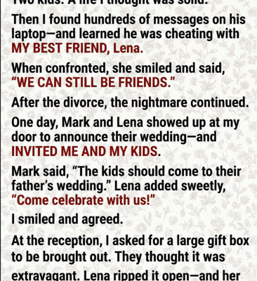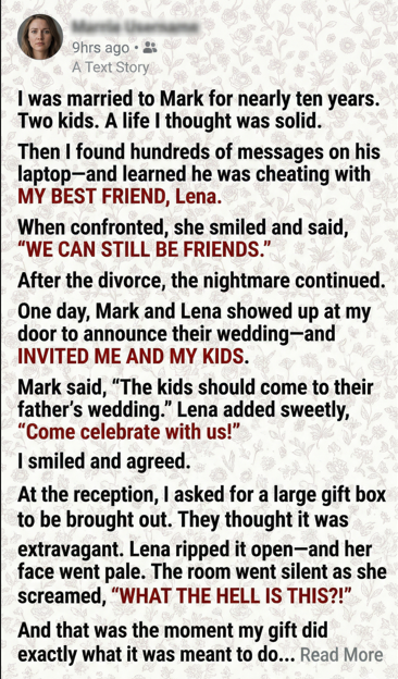 When Sarah is invited to the wedding of her ex-husband and ex-best friend, she chooses grace over chaos, or so it seems. In a story about betrayal, resilience, and the power of quiet truth, one woman brings a gift that no one saw coming⊠and no one will ever forget.