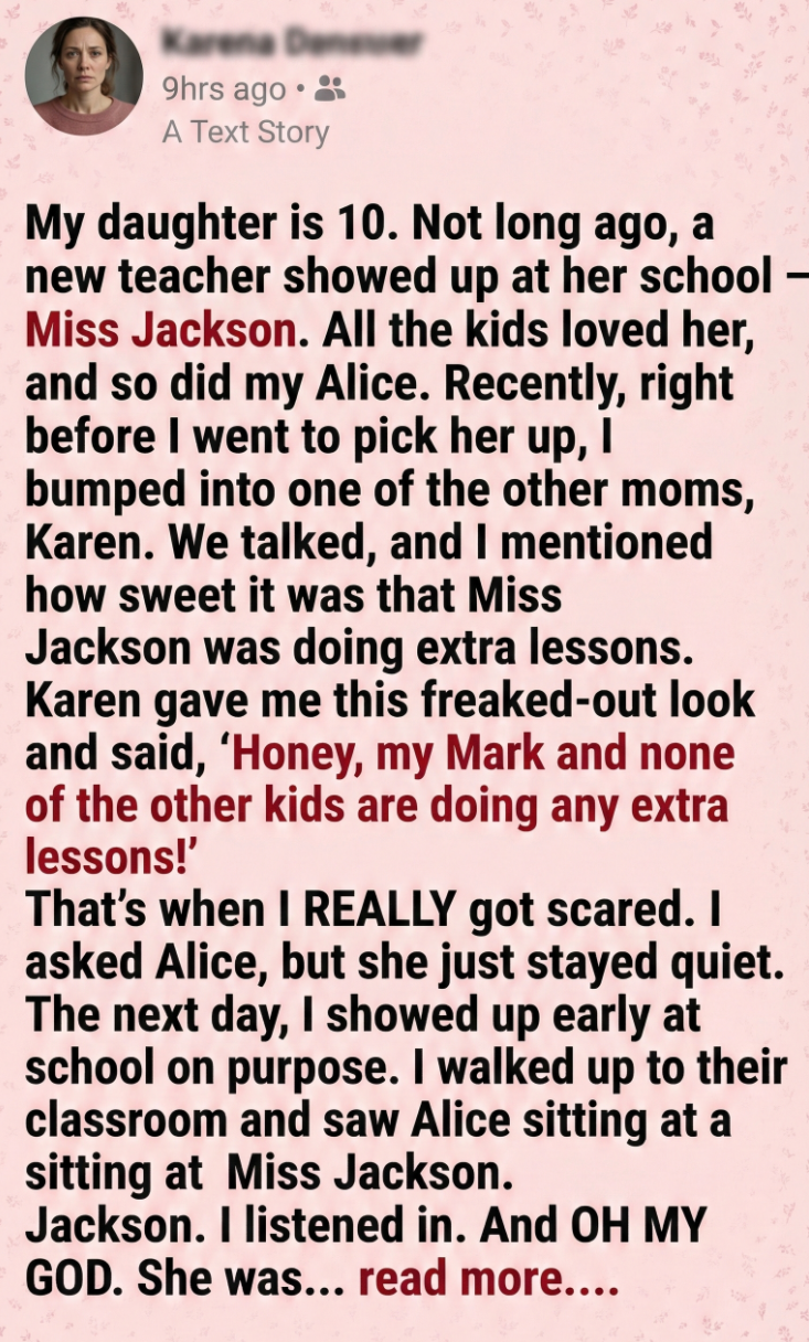 So when Miss Jackson started at Clearview Elementary, I was relieved. She had this way about her—young, maybe early thirties, stylish in that earthy kind of way, and always smiling like she knew something wonderful that hadn’t happened yet. Alice started talking about school more, and even wanted to get there early. She’d chatter away about “Miss J” and how she made class “less boring.”