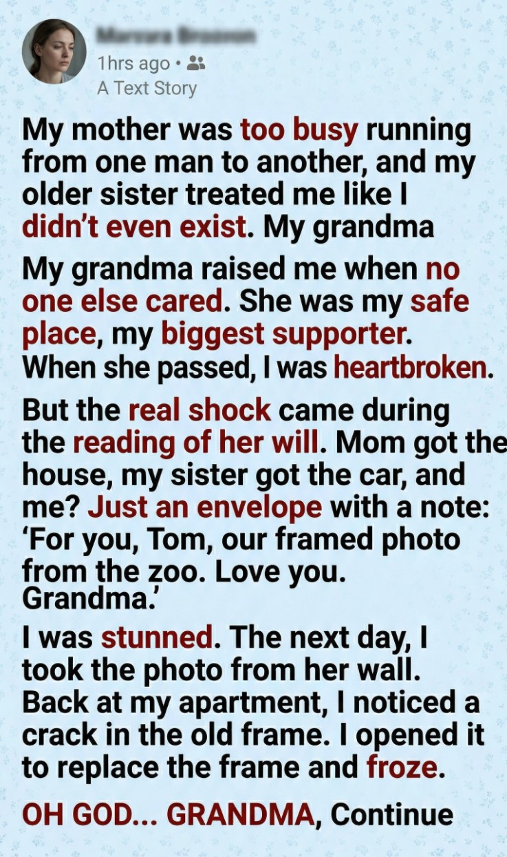 The next day, I went back to her house while my mom and sister were busy arguing over furniture. I took the framed photo from the wall—the one of us at the zoo when I was ten. I was grinning, missing a tooth. Grandma had her arm around me, eyes crinkled with joy.