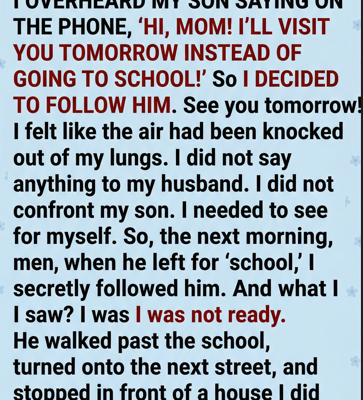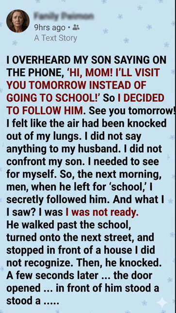 I OVERHEARD MY SON SAYING ON THE PHONE, âHI, MOM! IâLL VISIT YOU TOMORROW INSTEAD OF GOING TO SCHOOL!â So I DECIDED TO FOLLOW HIM. See you tomorrow! â I felt like the air had been knocked out of my lungs. I did not say anything to my husband. I did not confront my son. I needed to see for myself. So, the next morning, when he left for âschool,â I secretly followed him. And what I saw? I was not ready. He walked past the school, turned onto the next street, and stopped in front of a house I did not recognize. Then, he knocked. A few seconds later ⌠the door opened ⌠in front of him stood a âŚ..