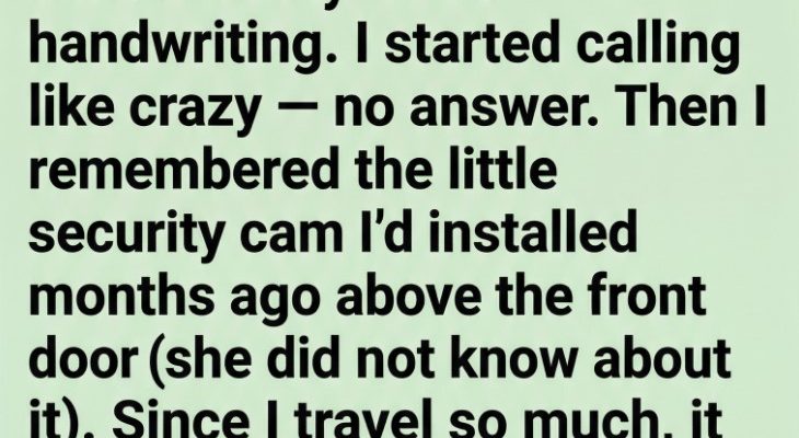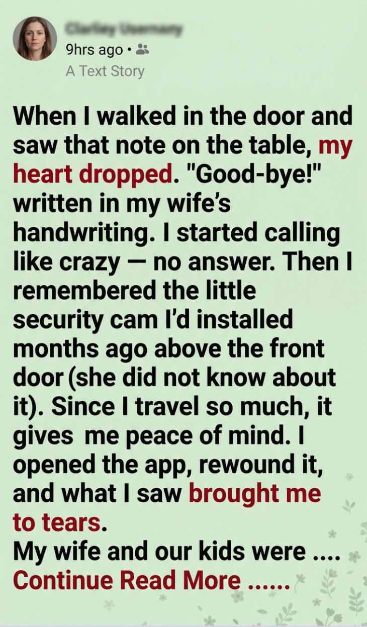 When I walked in the door and saw that note on the table, my heart dropped. āGood-bye!ā written in my wifeās handwriting. I started calling her like crazy āĀ no answer.Ā Then I remembered the little security cam Iād installed months ago above the front door (she did not know about it). Since I travel so much, it gives me peace of mind.