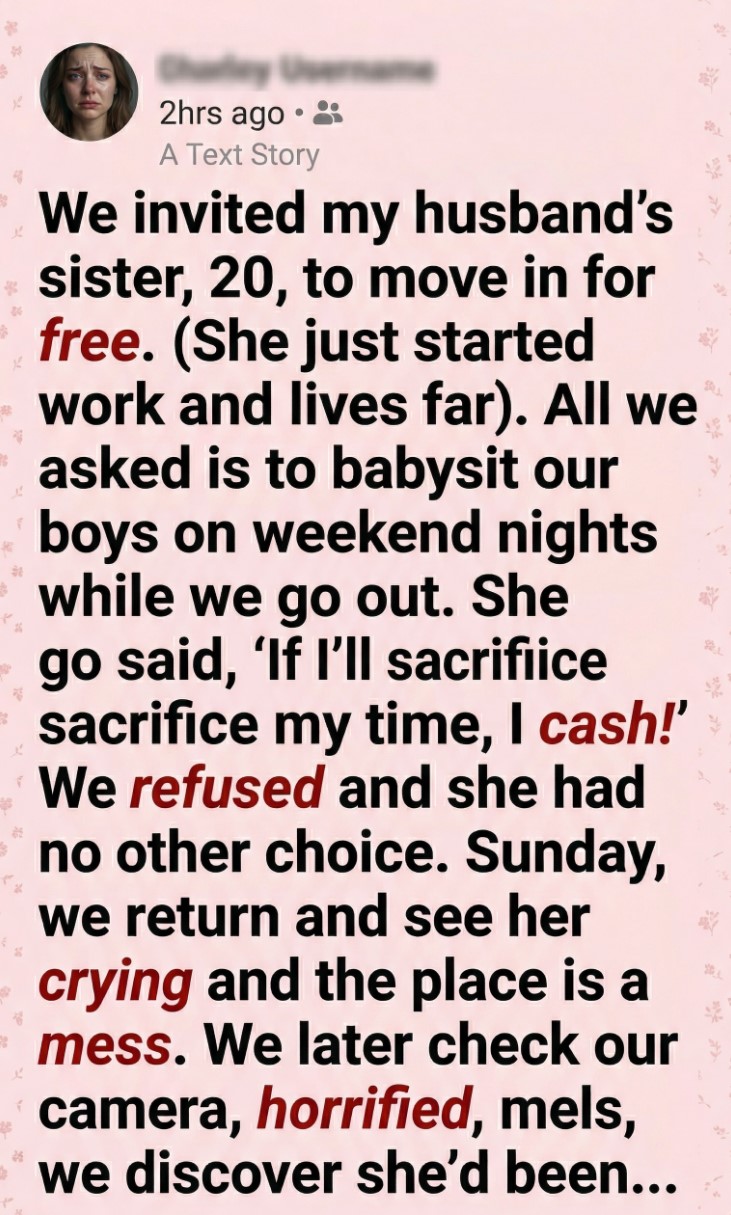 We welcomed my husband’s sister, Lily, to live with us, thinking we were giving her a hand. A room, meals, stability—no rent. All we asked was a little help with our boys on weekend evenings. Simple. Fair. Family supporting family.