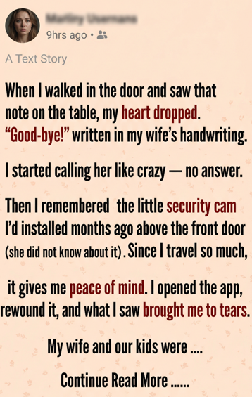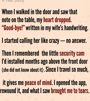 When I walked in the door and saw that note on the table, my heart dropped. “Good-bye!” written in my wife’s handwriting. I started calling her like crazy — no answer. Then I remembered the little security cam I’d installed months ago above the front door (she did not know about it). Since I travel so much, it gives me peace of mind.