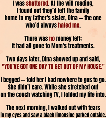 “Your parents set up a contingency clause,” Sterling explained. “It was a test of character. The terms were simple: If Dina took you in and cared for you despite there being ‘no money,’ the family trust—worth roughly five million dollars—would be unlocked and split evenly between the two of you.”