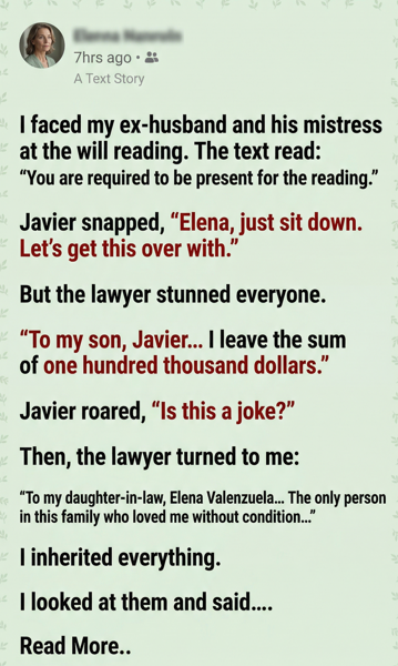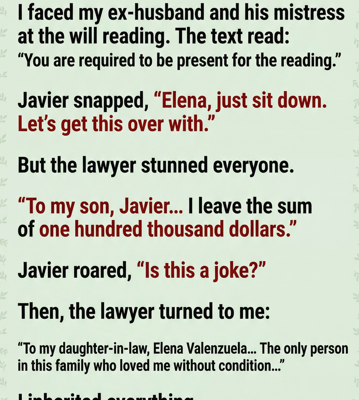 The heavy oak door of the notary’s office felt like a barrier between two worlds, separating the quiet sanity of the hallway from the suffocating toxicity waiting inside, yet I walked through it knowing that my ex-husband, his mistress, and his mother would be waiting like vultures circling a carcass. I showed up anyway, not because I wanted to see the faces that had haunted my nightmares for the past year, nor because I missed the life I had violently lost, but because the message on my phone had made my stomach drop with a command I couldn’t ignore: “You are required to be present for the reading.” When I finally stepped into the room, the air was thick with the scent of expensive leather and old paper, a smell that usually comforted me but today made me nauseous. I didn’t sit down in the empty chair they had left for me; instead, I stayed standing near the bookshelf with my arms crossed tight against my chest, as if keeping my body rigid enough would prevent my heart from betraying the anxiety thundering against my ribs. The lawyer, Gavin Herrera, looked up from his desk, adjusted his wire-rimmed glasses, and spoke with a professional calm that contrasted sharply with the tension in the room, looking directly at me to say, “Mrs. Valenzuela… I’m glad you decided to join us.”