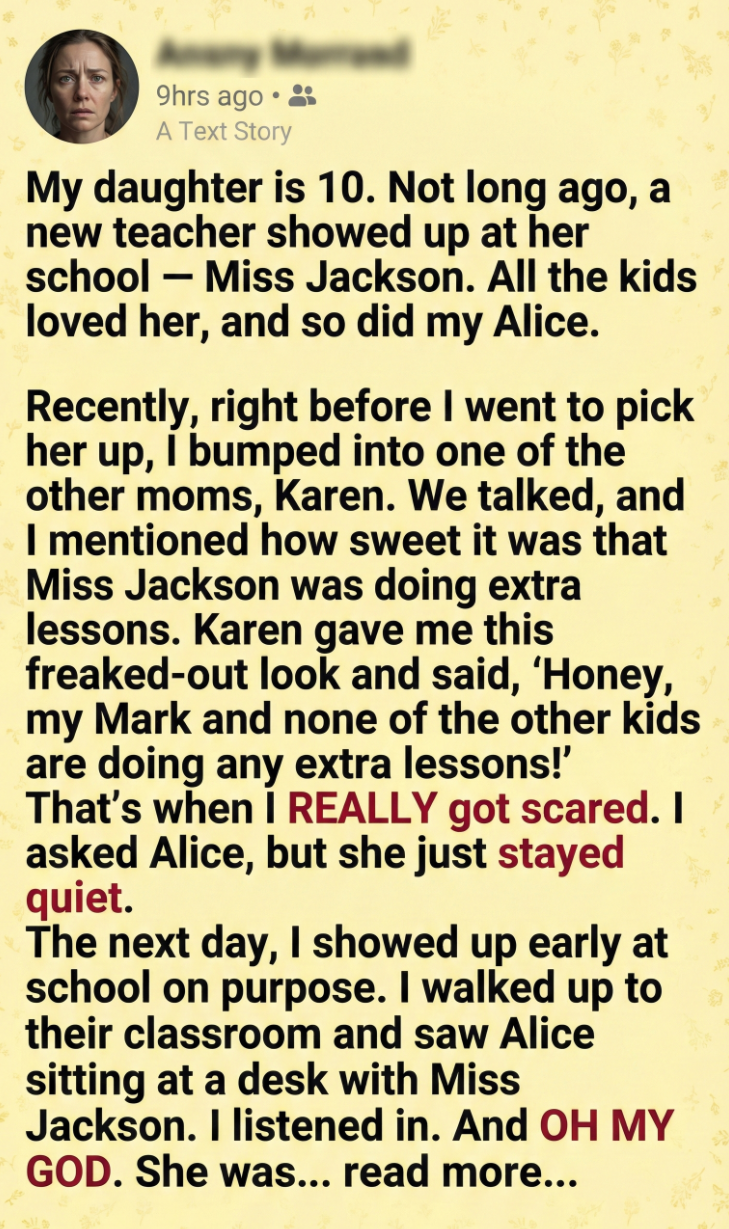 So when Miss Jackson started at Clearview Elementary, I was relieved. She had this way about her—young, maybe early thirties, stylish in that earthy kind of way, and always smiling like she knew something wonderful that hadn’t happened yet. Alice started talking about school more, and even wanted to get there early. She’d chatter away about ā€œMiss Jā€ and how she made class ā€œless boring.ā€