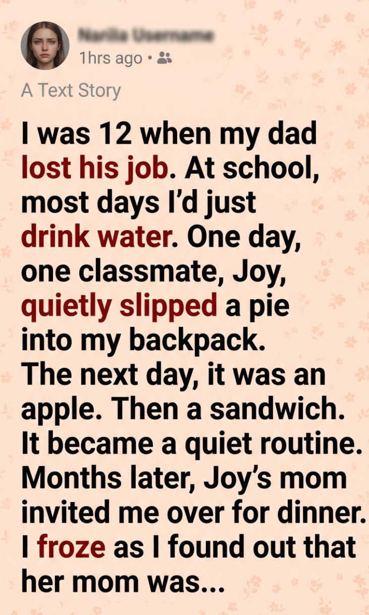 Joy’s mom welcomed me in like I belonged. The table was full—more food than I had seen in months. Joy nudged me to sit, like it was the most normal thing in the world.