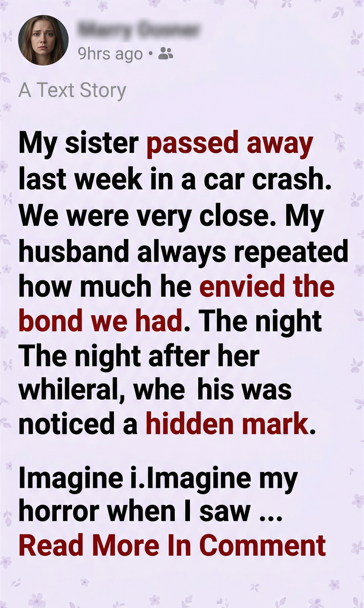 My sister passed away last week in a car crash. We were very close. My husband always repeated how much he envied the bond we had.