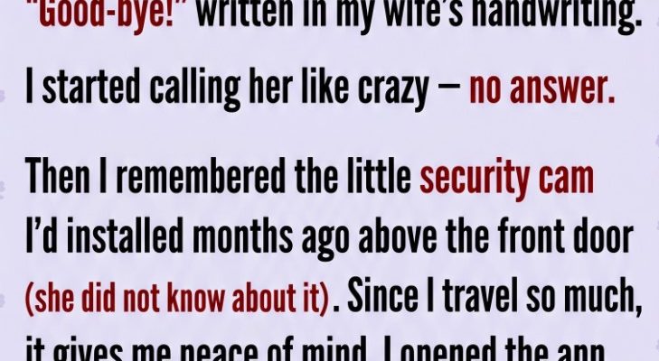 When I walked in the door and saw that note on the table, my heart dropped. āGood-bye!ā written in my wifeās handwriting. I started calling her like crazy āĀ no answer.Ā Then I remembered the little security cam Iād installed months ago above the front door (she did not know about it). Since I travel so much, it gives me peace of mind.