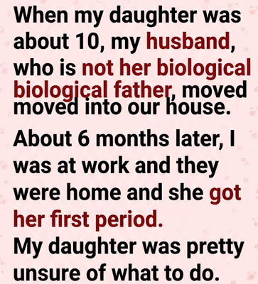 When my daughter was about 10, my husband, who is not her biological father, moved into our house. About 6 months later, I was at work and they were home when she got her first period. My daughter was pretty unsure of what to do.