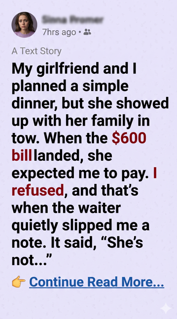 Nothing extravagant. Just a quiet Friday night at a mid-range restaurant downtown. We’d both had long weeks, and I thought it would be a nice chance to unwind, talk, and maybe discuss the next step in our relationship. We’d been together almost a year. I was starting to think about the future.