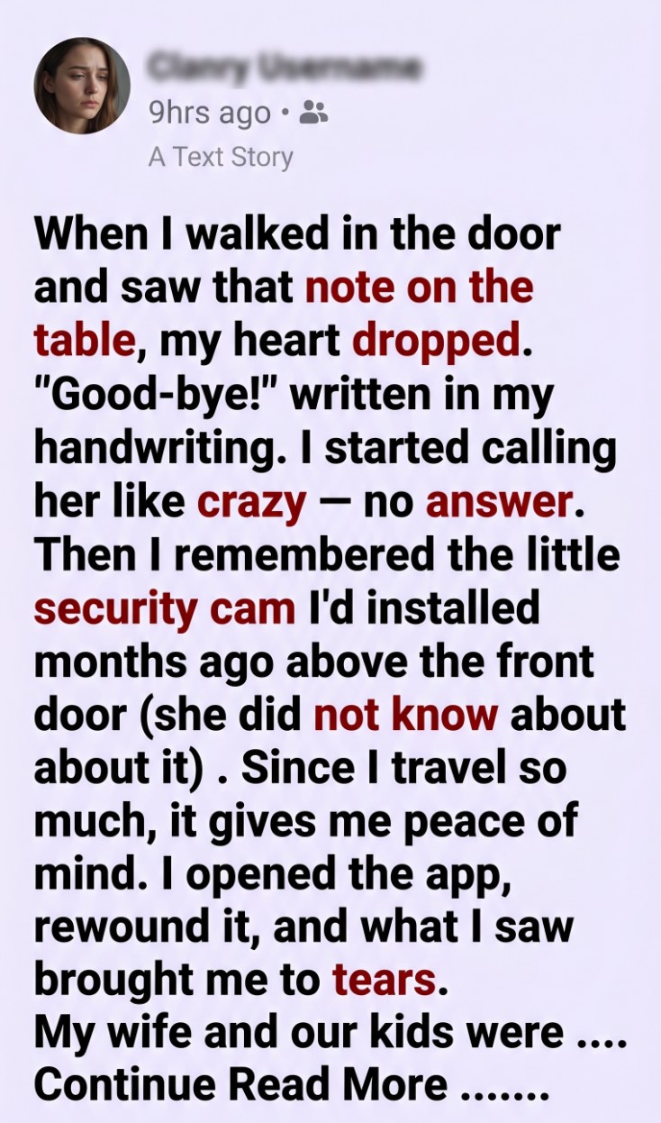 When I walked in the door and saw that note on the table, my heart dropped. āGood-bye!ā written in my wifeās handwriting. I started calling her like crazy āĀ no answer.Ā Then I remembered the little security cam Iād installed months ago above the front door (she did not know about it). Since I travel so much, it gives me peace of mind.