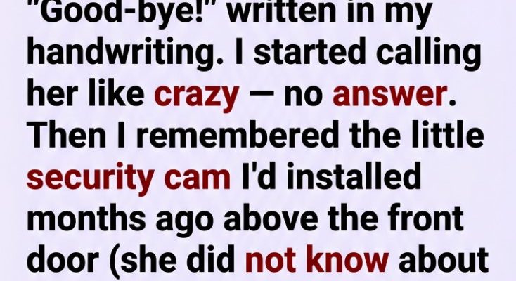When I walked in the door and saw that note on the table, my heart dropped. āGood-bye!ā written in my wifeās handwriting. I started calling her like crazy āĀ no answer.Ā Then I remembered the little security cam Iād installed months ago above the front door (she did not know about it). Since I travel so much, it gives me peace of mind.