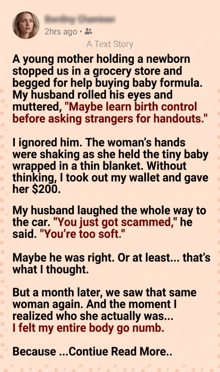 She explained that a month ago had been the worst day of her life. Her husband had suddenly passed away, and she had been left alone with a newborn and no nearby family. Her bank account had been temporarily frozen due to paperwork issues after his death, and she couldn’t access her money.