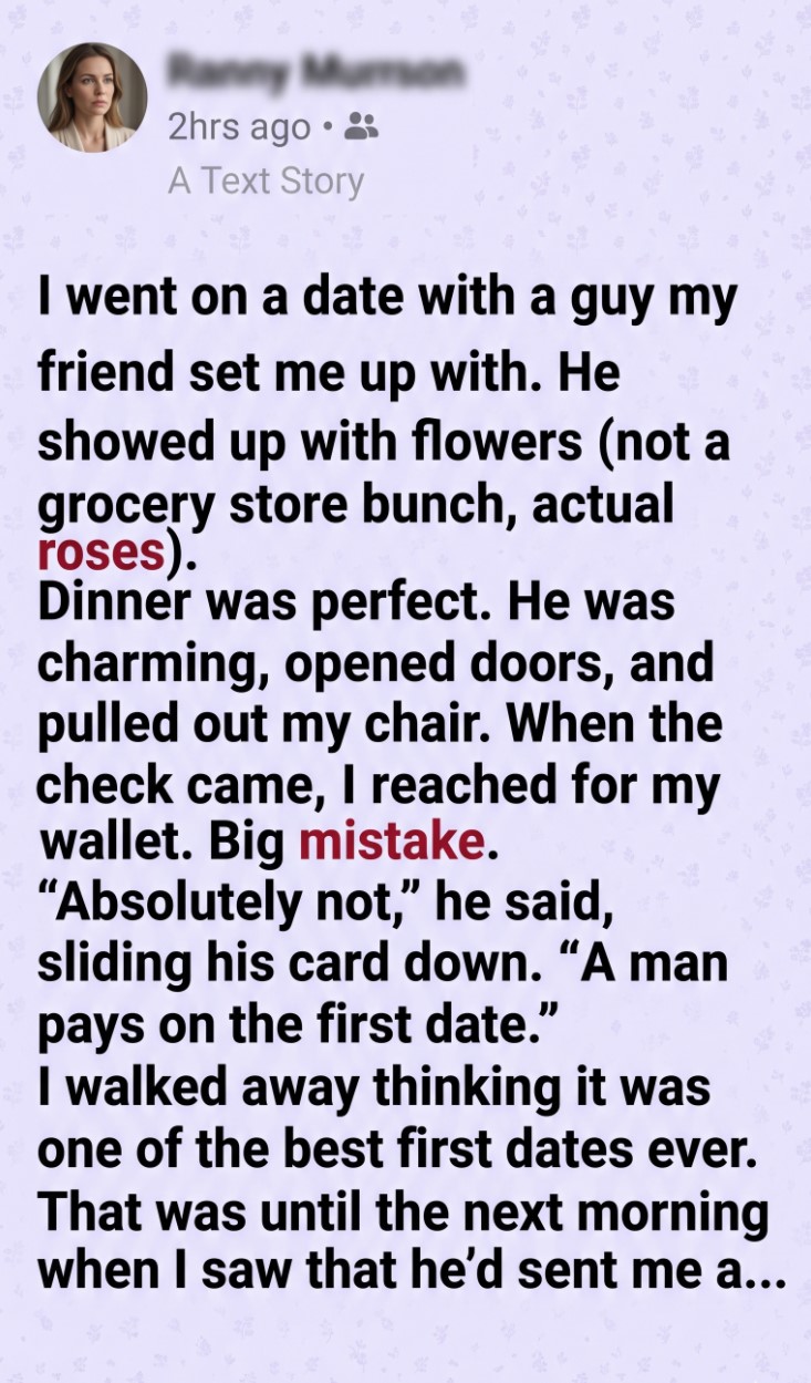 This was the same man who dramatically slid his card across the table and said, “A man pays on the first date.” The same man who refused to let me touch my wallet. The same man who made a whole speech about chivalry.
