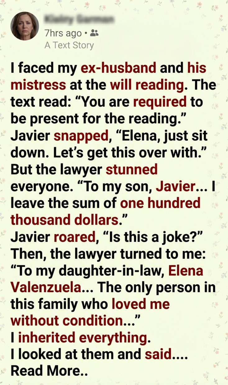 The heavy oak door of the notary’s office felt like a barrier between two worlds, separating the quiet sanity of the hallway from the suffocating toxicity waiting inside, yet I walked through it knowing that my ex-husband, his mistress, and his mother would be waiting like vultures circling a carcass. I showed up anyway, not because I wanted to see the faces that had haunted my nightmares for the past year, nor because I missed the life I had violently lost, but because the message on my phone had made my stomach drop with a command I couldn’t ignore: “You are required to be present for the reading.” When I finally stepped into the room, the air was thick with the scent of expensive leather and old paper, a smell that usually comforted me but today made me nauseous. I didn’t sit down in the empty chair they had left for me; instead, I stayed standing near the bookshelf with my arms crossed tight against my chest, as if keeping my body rigid enough would prevent my heart from betraying the anxiety thundering against my ribs. The lawyer, Gavin Herrera, looked up from his desk, adjusted his wire-rimmed glasses, and spoke with a professional calm that contrasted sharply with the tension in the room, looking directly at me to say, “Mrs. Valenzuela… I’m glad you decided to join us.”