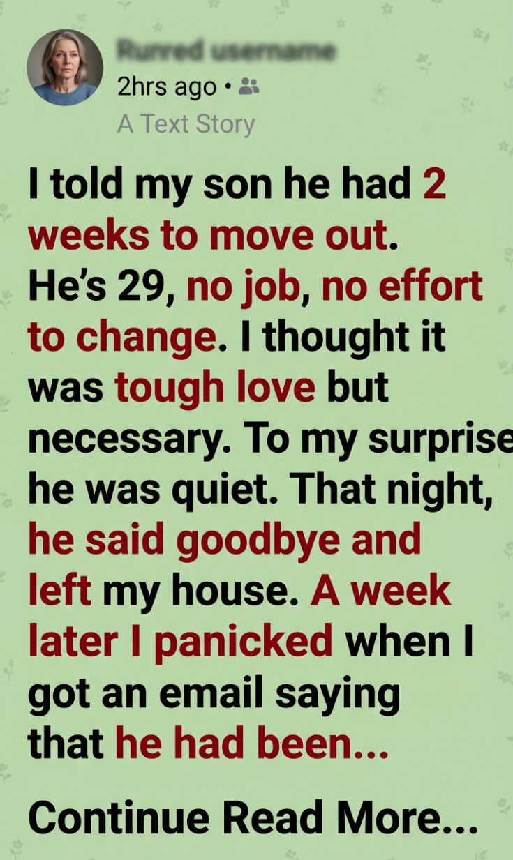 For years, I had watched him waste time, sleeping late, playing games, and ignoring every chance to build a future. I was frustrated and scared he would never change. That’s why I gave him those two weeks. I thought it was the only way.